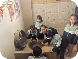在农耕党史馆,幼儿在讲解员引导下参观老式农具、历史史料,通过犁耙、纺车等实物及老照片,了解革命时期先辈们自力更生的农耕故事,体会粮食来之不易,萌发珍惜粮食、艰苦奋斗的意识。
