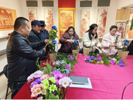 活动现场,花艺老师通过理论讲解与实操示范相结合的方式,向村民传授花材选择、色彩搭配、造型设计等插花技巧。村民围坐一堂,相互交流、互帮互助,剪枝、修叶、插花的过程中,欢声笑语不断。大家充分发挥创意,将各色鲜花巧妙组合,制作出一盆盆造型别致、寓意美好的插花作品。活动间隙,村干部结合身边民族团结故事,宣讲党的民族政策,引导村民自觉维护民族团结,共同营造“各民族像石榴籽一样紧紧抱在一起”的良好氛围。