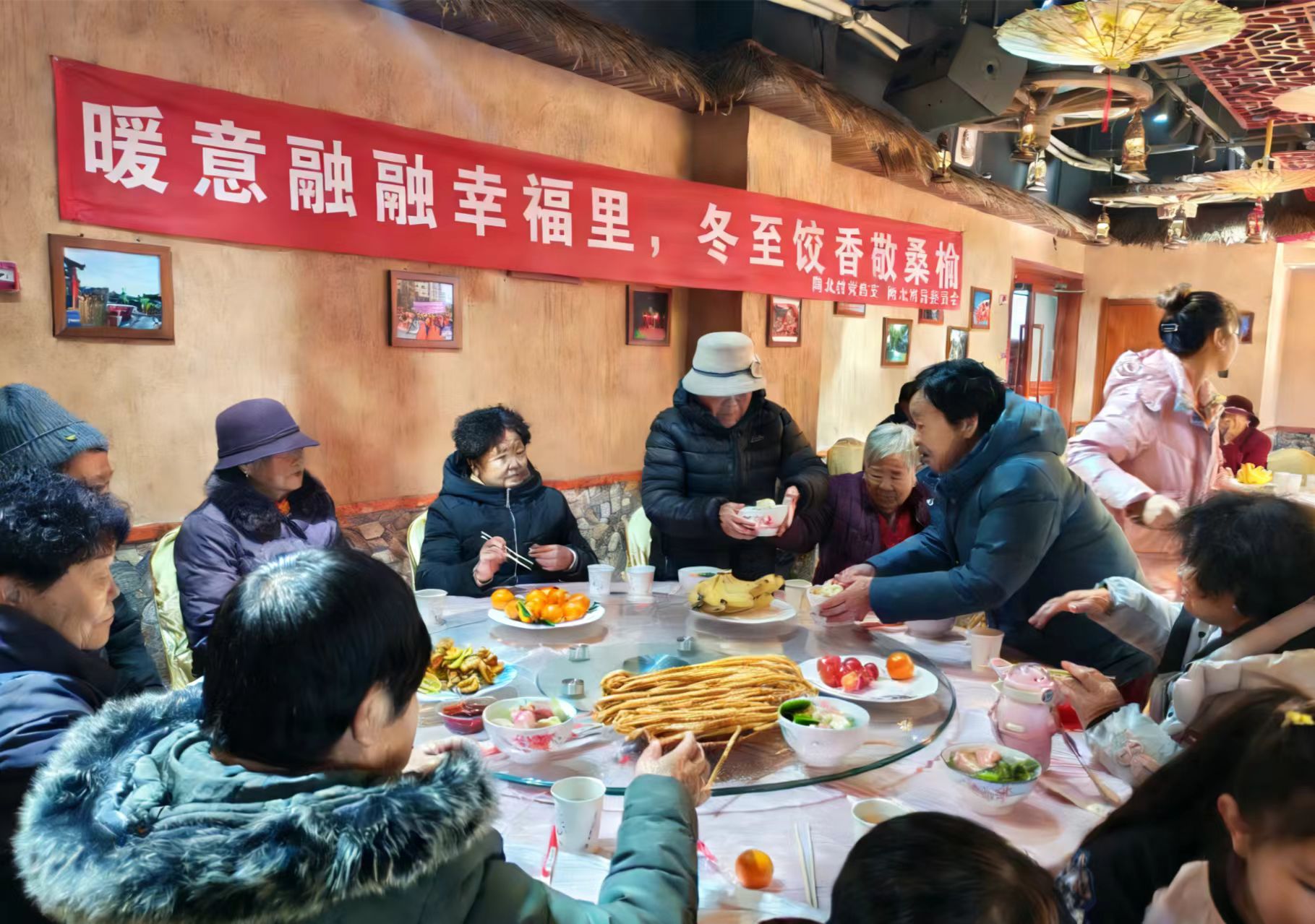 活动现场热闹非凡,文化赋能与节日关怀双向奔赴。台上,来自各区县的文艺演出队伍轮番登台,歌舞、曲艺等节目精彩纷呈,既展现了基层文艺的蓬勃活力,也通过群众喜闻乐见的形式传递了乡村振兴的奋进力量,让“艺起行动”的志愿服务理念深入人心;台下,陶北村幸福里幸福专员提前筹备,精心包制的一千多个冬至饺子整齐摆放,热气腾腾的饺香弥漫现场。老人们围坐一堂,品尝着鲜香可口的饺子,拉着家常话着心愿,脸上洋溢着幸福的笑容,每一口饺子都承载着对长者的敬意与关怀,让“敬桑榆”的传统美德在冬日里愈发浓厚。