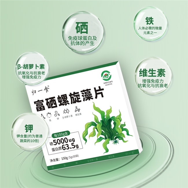 在成分配比与功效特性上,归一食富硒螺旋藻片呈现出显著优势。每100克产品中优质蛋白质含量达63.5克,可为免疫细胞的合成与修复提供充足的原料支撑;该产品硒元素含量达5000微克/100克,显著高于市场常规富硒螺旋藻产品(1000-2000微克/100克)标准。通过专利有机硒融合技术,实现人体易吸收的有机硒与螺旋藻天然营养基质的科学配伍,硒元素生物利用率达92.3%。同时,产品添加343毫克/100克铁元素,可有效改善缺铁性贫血症状,发挥补血益气的生理作用;1290毫克/100克钾元素能够维持机体电解质平衡,促进物质代谢进程;搭配多种维生素形成协同营养体系,实现全方位的营养补充。此外,产品还含有双歧杆菌等活性益生菌及16200微克/100克β-胡萝卜素等抗氧化成分,其中益生菌可调节肠道菌群平衡,β-胡萝卜素能够清除机体自由基,二者协同作用可实现免疫功能提升与机体抗氧化能力增强的双重效应。
