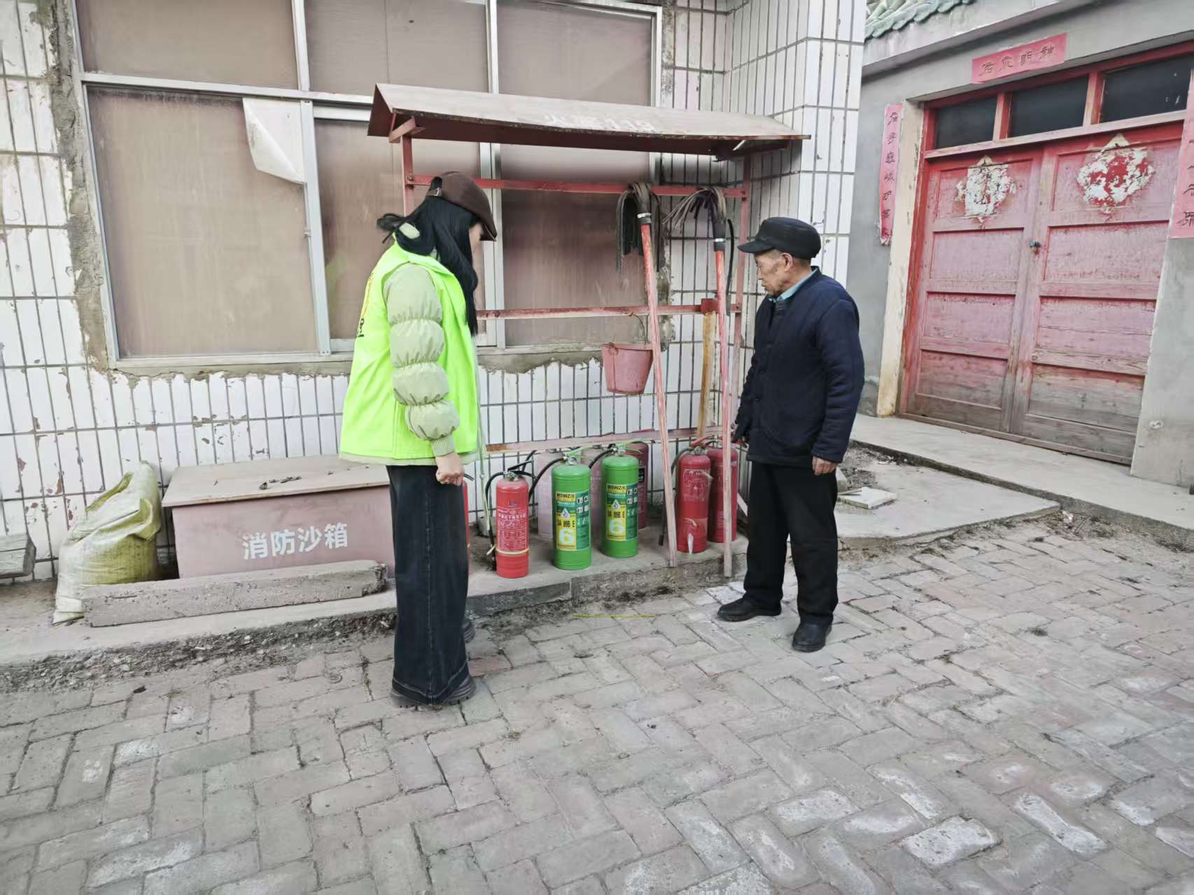 本次检查覆盖了村内公共区域及宗教活动场所。工作人员重点查看了村委会、老年活动中心等人员密集处,以及村庙的消防安全情况。检查内容核心为灭火器等消防器材的有效性,具体包括是否按标准配备、压力指针是否处于绿区、瓶体有无锈蚀损坏、是否在有效期内、周围是否存在堆放杂物影响取用等情况。同时,也对各场所的用火用电管理、安全疏散通道是否畅通进行了查看。