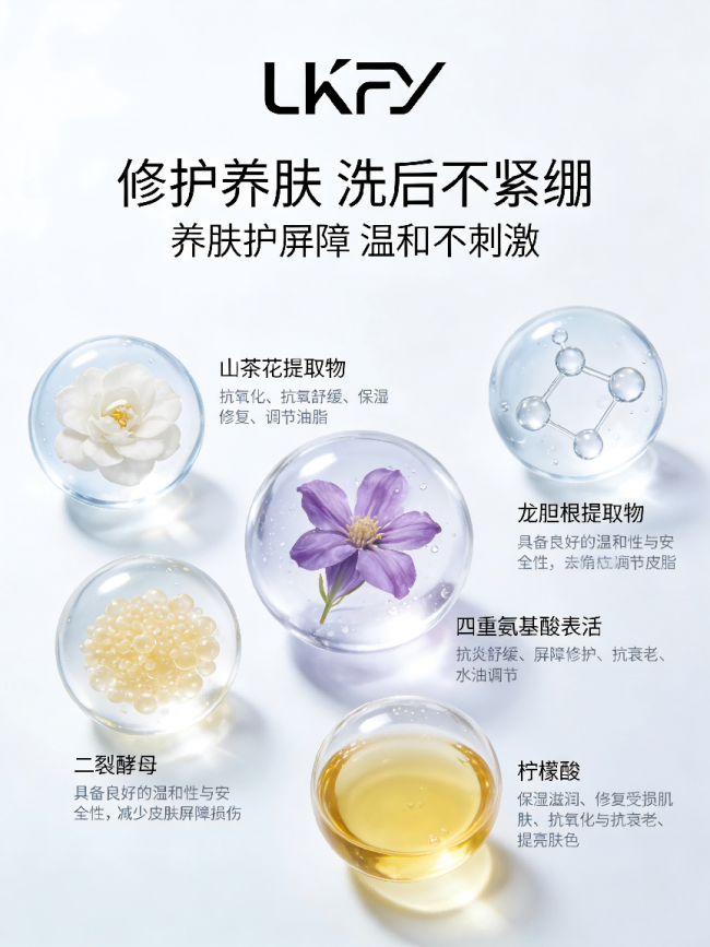 ・二裂酵母 + 龙胆根提取物:深入滋养角质层,促进肌肤修护再生,提升肌肤锁水力,减少外界刺激带来的不适,干皮、屏障受损肌越洗越健康!