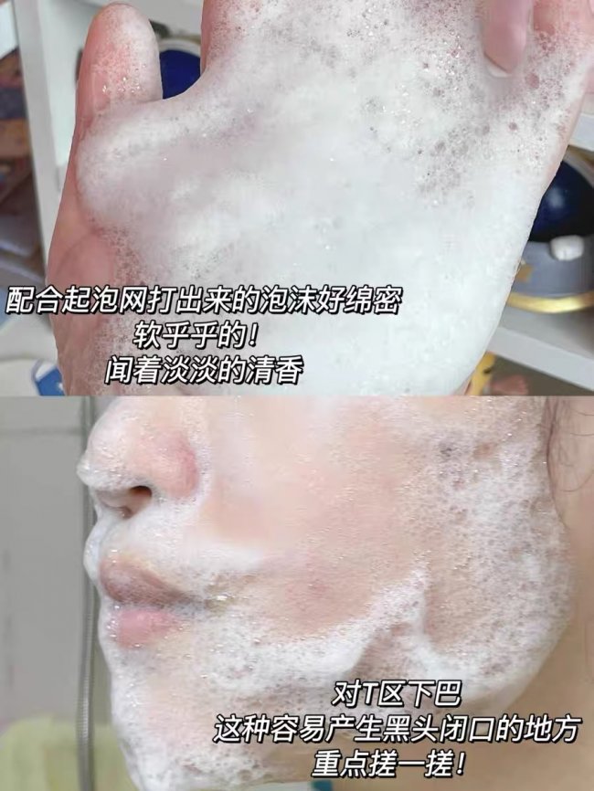 ・质地:丝绒奶霜质地,加点水搓 3 秒,就能揉出绵密云朵泡,上脸软乎乎的,完全不拉扯肌肤!