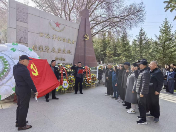 祭扫仪式正式开始,首先,全体人员肃立默哀,在低沉肃穆的氛围中,大家集体静立,向为革命事业英勇献身的烈士们致以最崇高的敬意,默哀环节寄托着对先烈的无尽哀思,也让在场每一个人深刻感悟今天幸福生活的来之不易。之后全体人员整齐列队、神情肃穆,向烈士敬献鲜花。大家共同追忆烈士英勇事迹,深切感念其为国家独立、人民幸福作出的无私牺牲与卓越贡献。在追思缅怀中感悟英烈忠诚担当的崇高精神,接受了一场直击心灵的红色思想洗礼。活动中,宣传委员晋爱鑫还带领大家重温革命先烈浴血奋战的英雄事迹,在场党员面向党旗重温入党誓词,坚定理想信念。
