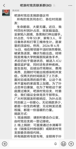 近日,西宁市城北区大堡子镇吧浪村一名村民突发意外重病,住院治疗期间花费高额医疗费用,家庭经济陷入极大困难,无力承担后续治疗开支。得知这一情况后,吧浪村党总支第一时间行动,正式发出爱心捐款倡议书,全力帮扶困难村民渡过难关。
